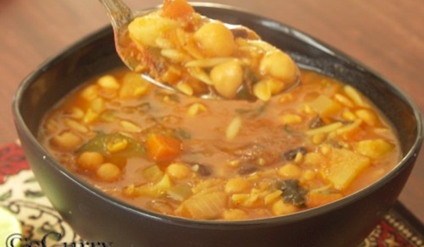 Un tarro pequeño de garbanzos,150g. de carne de cordero,1 vaso pequeño de lentejas,1 cebolla grande,1 kilo de tomates,6 cucharas grandes de cilantro y perejil,picados,4 cucharas grandes de apio picado,1 cuchara grande de tomate concentrado,1 vaso pequeño de fideos finos tipo “cabello de ángel”,1 cuchara pequeña de pimienta negra,½ cucharadita de jengibre molido,1 rama de canela,sal,agua y aceite de oliva.